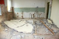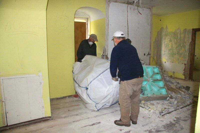 Beim 6. Arbeitseinsatz am 22.10.2016 wurden wieder Beräumungsarbeiten, wie z. B. der Abtransport von Dämmmaterial aus dem Dachboden durchgeführt. Die Fußböden im Obergeschoß wurden entlang der Wände geöffnet, damit die Balkenköpfe der Deckenbalken begutachtet werden können. Auch eine Wand wurde abgebrochen. Die Heizungsanlage ist nun komplett demontiert.