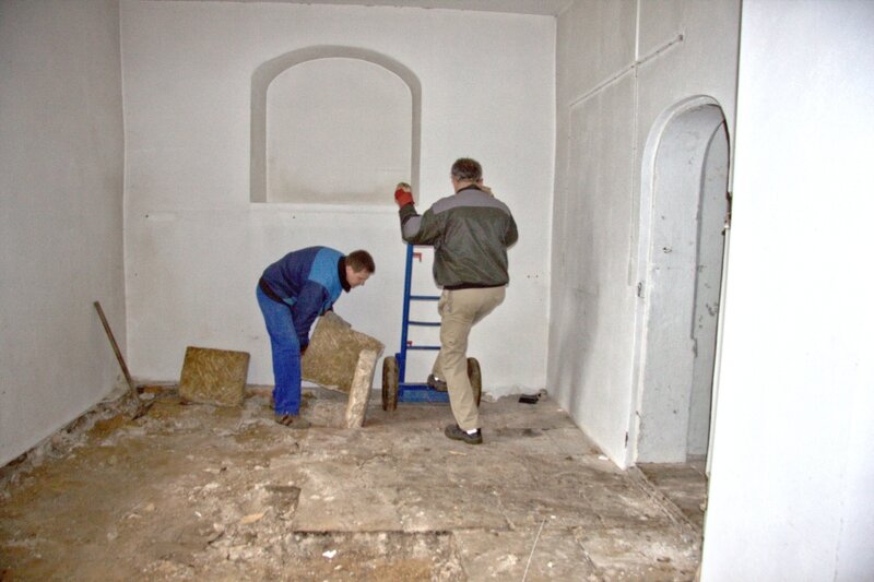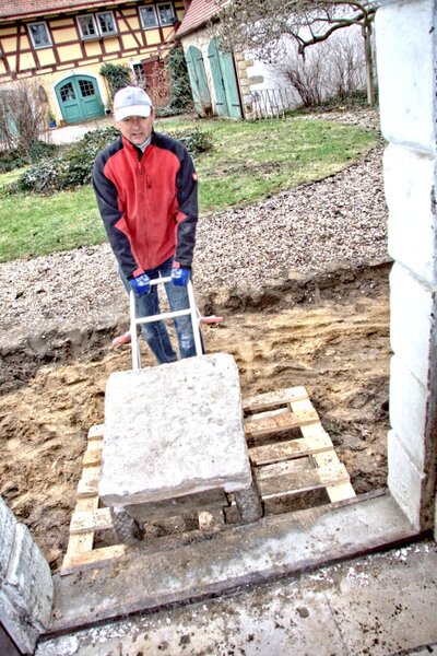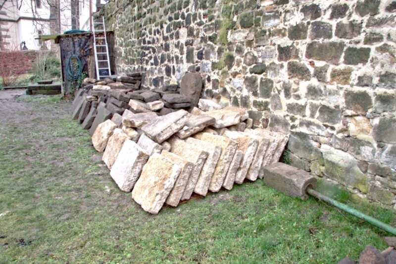 Am 18.03.2017 wurden die Sandsteinplatten im Inneren des Hauses ausgebaut und über ein (Hindernis) Parcours in den Garten zur Ablagerung gebracht. Auch ein Teil des Bauschuttes vom Dachboden wurde abtransportiert.
