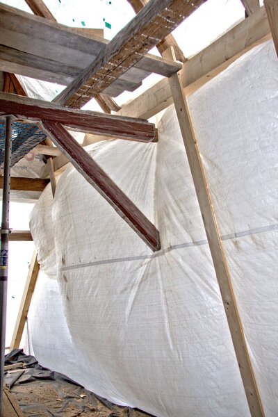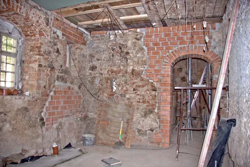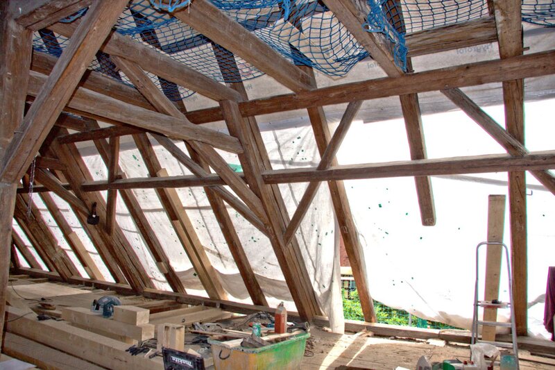 Weil im eingemauerten Fachwerk auf der Nordseite im Bereich der Linde völlig unerwartet ein größerer Befall von Hausschwamm festgestellt wurde, muß ein großer Teil der Wand und der Balken entfernt, eine großflächige Behandlung gegen Pilzbefall durchgeführt werden und die Wand neu aufgebaut werden.