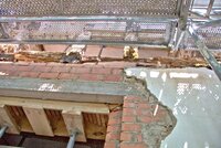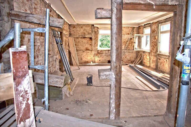 Im Obergeschoß wurden in den Räumen auf der Ostseite bereits die Dielung verlegt. An der Westseite mußte das Fachwerk auf der Hofseite freigelegt werden, damit die Beseitigung der Holzschäden beginnen kann.