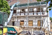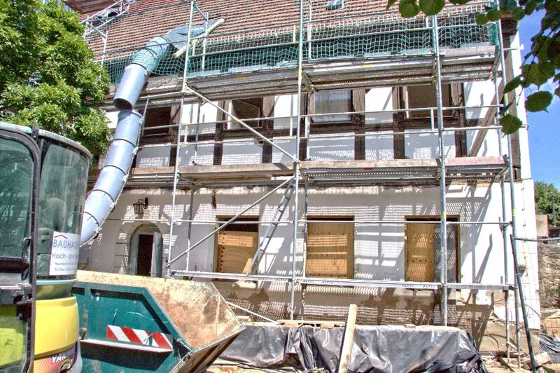 An der Hofseite, der Gartenseite und der Kirchseite des Hauses wurde ein Gerüst aufgestellt.