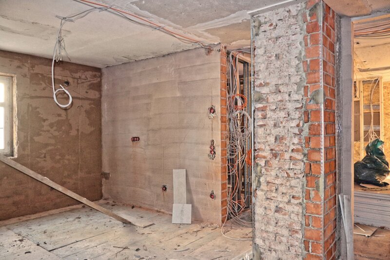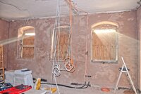 Im Erdgeschoß wurde auf die Wände der Rohputz aufgebracht und die Elektriker haben begonnen die Elektroinstallation zu verlegen.
