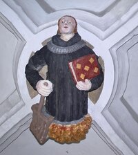 Nach umfangreichen Restaurierungsarbeiten empfängt uns die Eingangshalle der Emmauskirche in Altkaditz nun wieder in jener Farbfassung, die sie bereits zu ihrer Entstehung in vorreformatorischer Zeit trug. Als Blickfang grüßt der heilige Laurentius im dunklen Gewand. Im linken Arm trägt er die Heilige Schrift und in der rechten Hand das Feuerrost, auf welchem er im Jahre 258 zu Tode gefoltert wurde, weil er vor dem Kaiser die Gemeindeglieder als die wahren Schätze der Kirche bezeichnet hatte. Auf seinen Märtyrertod deutet auch der Flammenkranz zu seinen Füßen.
