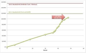 Damit fehlen für den Abschluss des 1. Bauabschnittes, der die Dach- und Fassadenarbeiten am Turm und am Kirchenschiff beinhaltete, nur noch 14.000 EUR. Dank weniger Schäden als ursprünglich angenommen reduzierte sich auch die gesamte Bausumme.