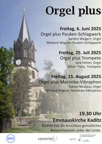 Auch in diesem Jahr gibt können Sie in der Reihe "Orgel-Plus" in der Emmauskirche Dresden-Kaditz 3 Konzerte erleben mit gemütlichem Beisammensein im Anschluss unter der Linde.