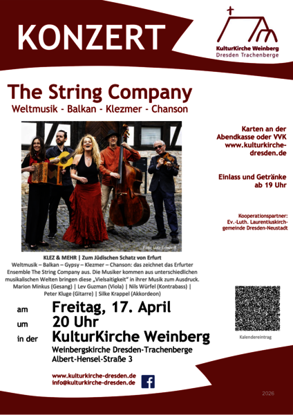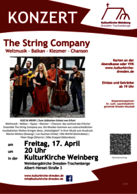Weltmusik – Balkan – Gypsy – Klezmer – Chanson: das zeichnet das Erfurter Ensemble The String Company aus. Die Musiker kommen aus unterschiedlichen musikalischen Welten bringen diese „Vielsaitigkeit“ in ihrer Musik zum Ausdruck.