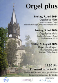 Auch diesen Sommer heißt es wieder „Orgel PLUS" in der Emmauskirche Dresden-Kaditz: Einmal im Monat jeweils freitags 19.30 Uhr.