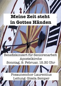 Festliche Bläsermusik wird am Sonntag, dem 9. Februar 2014, 15.30 Uhr, in der Apostelkirche Trachau erklingen. Unter Leitung von Gisela Semper spielt der Posaunenchor Laurentius ein Programm mit dem Titel "Meine Zeit steht in Gottes Händen!". Der Eintritt zu dem Benefizkonzert ist frei - die gesamte Kollekte kommt der Seniorenarbeit in unserer Gemeinde zugute.