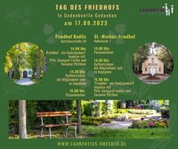Diese und ähnliche Fragen greift der Tag des Friedhofs unter dem Leitwort „In Gedenken / In Gedanken“ auch in diesem Jahr auf und lädt alle Generationen ein den Friedhof kennenzulernen und zu entdecken. An diesem Tag möchten wir auch auf unseren Friedhöfen zum Innehalten einladen, lauschen, ins Gespräch kommen. Gern sind unsere Friedhofsmitarbeitenden für Sie vor Ort, um bei einer Tasse Kaffee und Kuchen mit Ihnen ins Gespräch zu kommen.