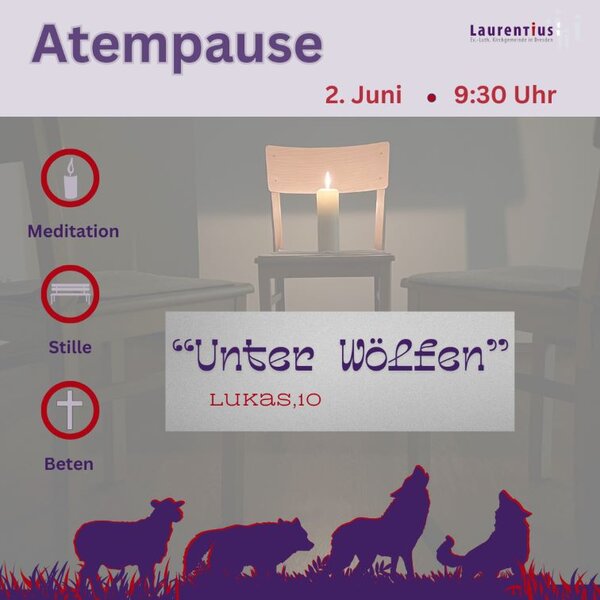 Der nächste Atempause-Gottesdienst findet am 2. Juni, um 9:30 Uhr in der Apostelkirche statt. Das Thema lautet "Unter Wölfen" und bezieht sich auf die ersten Zeilen des Kapitel 10 im Lukas-Evangelium.