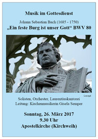 Am Sonntag, dem 26. März 2017 erklingt im Gottesdienst zum Kirchweihfest in der Apostelkirche Dresden-Trachau die Bachkantate „Ein feste Burg ist unser Gott“, BWV 80.