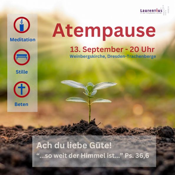 Das Team der Atempause freut sich, Interessierte und Menschen, die sich nach einer anstrengenden Woche nach einem Moment der Ruhe, nach Vertiefung und Gemeinschaft sehnen, zur nächsten Atempause, am Freitag, den 13.09.24, um 20 Uhr in die Weinbergskirche einzuladen.