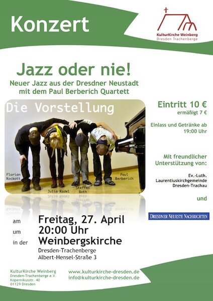 Am Freitag, dem 27. April 2012, gastiert das "Paul Berberisch Quartett" mit Jazzmusik aus der Dresdner Neustadt um 20 Uhr in der