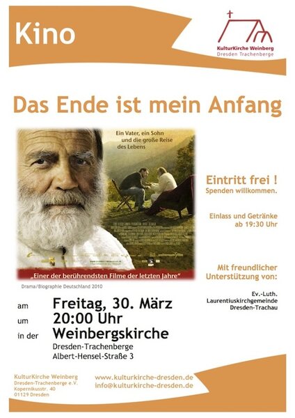 Am Freitag, dem 30. März, 20 Uhr, startet der Kulturkirche Weinberg Dresden-Trachenberge e.V. mit dem Kinofilm "Das Ende ist mein Anfang" in das Veranstaltungsjahr 2012.
