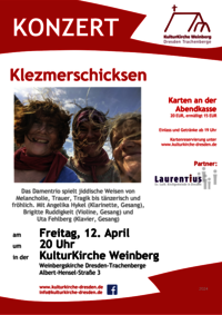 Musik von Melancholie, Trauer, Tragik - tänzersich bis fröhlich - ergänzt mit Texten jüdischer Dicherterinnen und Dichter. Mit Angelika Hykel (Klarinette, Gesang), Brigitte Ruddigkeit (Violine, Gesang) und Uta Fehlberg (Klavier, Gesang).