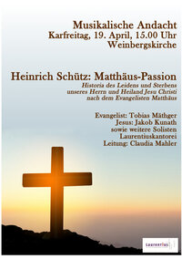 Unter der Leitung von Claudia Mahler führt die Laurentiuskantorei zusammen mit Solisten am Karfreitag, dem 19. April, 15.00 Uhr die Matthäus-Passion von Heinrich Schütz (1585-1672) anlässlich der Andacht zur Sterbestunde in der Weinbergskirche auf.