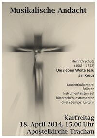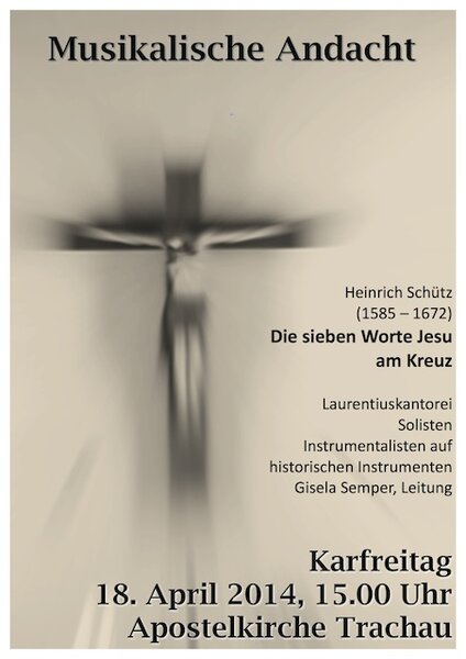 Zur musikalischen Andacht zur Sterbestunde Jesu erklingt am Karfreitag, dem 18. April, 15 Uhr, in der Apostelkirche geistliche Chormusik von Heinrich Schütz (1585-1672). Aufgeführt werden die "Die sieben Worte Jesu am Kreuz" von der Laurentiuskantorei, Solisten und Instrumentalisten auf historischen Instrumenten unter der Leitung von Gisela Semper.