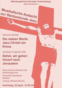 Die musikalische Andacht zur Sterbestunde Jesu am Karfreitag, dem 22. April, 15 Uhr, wird in diesem Jahr von der Kantorei der Weinbergskirche in der Weinbergskirche Dresden-Trachenberge gestaltet.
