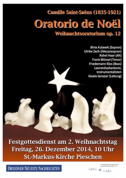 Zum Höhepunkt des Weihnachtsfestes erklingt am zweiten Weihnachtsfeiertag, dem 26. Dezember 2014, im traditionellen musikalischen Festgottesdienst in diesem Jahr in der St.-Markus-Kirche Pieschen unter Leitung von Gisela Semper das „Weihnachtsoratorium op. 12“ von Camille Saint-Saëns.