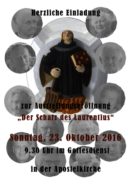 Die Ausstellungseröffnung "Der Schatz des Laurentius" findet nicht am 16. Oktober 2016, wie im Laurentius angekündigt, sondern am 23. Oktober 2016 im Gottesdienst 9.30 Uhr in der Apostelkirche statt.