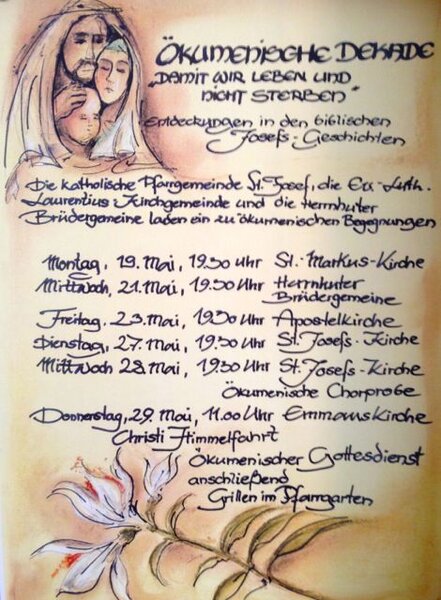 Auch in diesem Jahr sind Christen der Herrnhuter Brüdergemeine, der Katholischen Pfarrgemeinde St. Josef und der Ev.-Luth. Laurentiuskirchgemeinde zu ökumenischen Begegnungen eingeladen. Unter der Überschrift „Damit wir leben und nicht sterben“ suchen wir gemeinsam Anregungen, die biblischen Josefs-Geschichten neu zu entdecken.