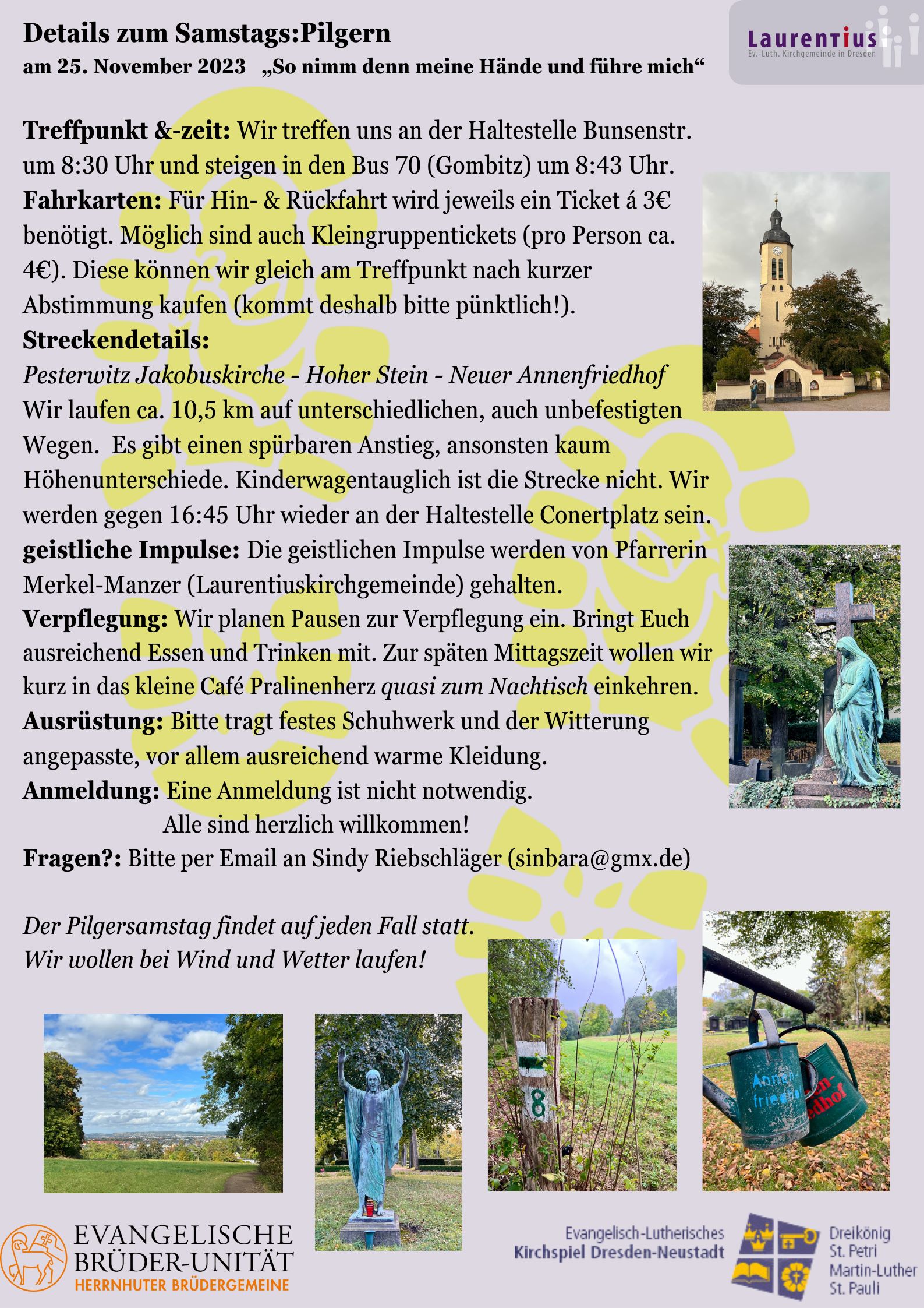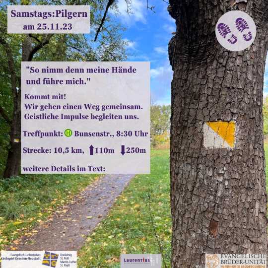 Wir freuen uns sehr, dass wir wieder einen Pilgersamstag vorbereitet haben. Am 25. November soll es von Pesterwitz über Coschütz nach Löbtau gehen. Pfarrerin Merkel-Manzer begleitet uns dabei mit geistlichen Impulsen.
