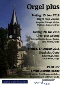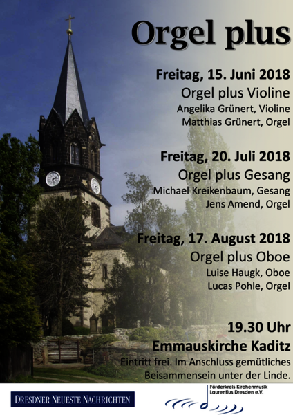 Auch dieses Jahr wird es wieder die Orgel-plus-Konzerte – jeweils freitags 19.30 Uhr – in der Emmauskirche Kaditz geben. Am Freitag, dem 15. Juni startet Frauenkirchenkantor Matthias Grünert mit Orgel plus Violine, gespielt von Angelika Grünert. Danach wird es am 20. Juli romantisch mit Gesang von Michael Kreikenbaum und Organist Jens Amend. Sie musizieren ihr Programm „Ein Lob der Liebe“ mit altitalienischen Arien und Orglewerken aus der Romantik. Den Abschluss der Sommerkonzertreihe bildet am 17. August die Kombination Orgel plus Oboe mit Werken von Vivaldi, Bach, Telemann, Krebs u.a. – gespielt von Lucas Pohle an der Orgel und Luise Haugk auf der Oboe.