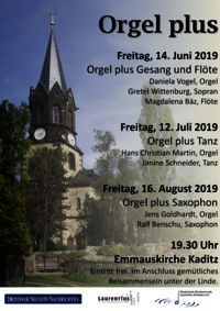 Die diesjährige Orgel plus Konzertreihe in der Emmauskirche Kaditz startet am Freitag, dem 14. Juni, um 19.30 Uhr mit einem Quartett. Daniela Vogel (Orgel), Gretel Wittenburg (Sopran), Magdalena Bäz (Blockflöte) und Stefan Baier (Violoncello) bringen Musik von Barock bis Romantik unter dem Motto „Singe, jauchze“ zu Gehör. Teil des Programms sind auch die Variationen über „Geh aus, mein Herz und suche Freud“ von Gottfried Fischer.