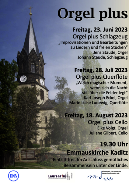 Auch diesen Sommer heißt es wieder „Orgel PLUS" in der Emmauskirche Dresden-Kaditz: Einmal im Monat jeweils freitags 19.30 Uhr. Dabei startet Kirchenmusikdirektor Jens Staude mit seinem Sohn Johann am Freitag, dem 23. Juni, 19.30 Uhr, mit Orgel plus Schlagzeug. Es erklingen Improvisationen und Bearbeitungen zu Liedern und freien Stü-cken.