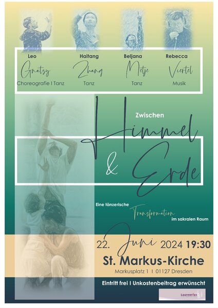 Am Samstag, dem 22. Juni, wird 19.30 Uhr eine Tanzperformance in der St.-Markus-Kirche zu erleben sein. „Zwischen Himmel und Erde“ ist ein Stück, das extra für den sakralen Raum entwickelt wurde und sich mit den Themen der Nächstenliebe, der zwischenmenschlichen und sozialen Strukturfindung, der Beziehung von Mensch, Mensch und Gott im Raum zwischen Himmel und Erde performativ, tänzerisch und musikalisch auseinandersetzt. Begleitet werden die Tanzenden von der Kantorin der Jugendkirche Dresden Rebecca Viertel.