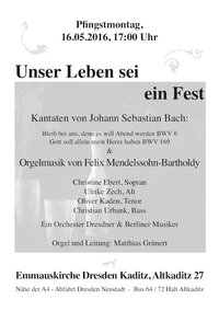 Am Pfingstmontag, dem 16. Mai 2016, erklingen um 17 Uhr in der Emmauskirche Altkaditz unter der Leitung des Kantors der Dresdner Frauenkirche, Matthias Grünert, zwei Kantaten von Johann Sebastian Bach und Orgelmusik von Felix Mendelssohn Bartholdy. Weitere Ausführende sind Christine Ebert (Sopran), Ulrike Zech (Alt), Oliver Kaden (Tenor) und Christian Urbank (Bass). Begleitet werden die Sängerinnen und Sänger von einem Orchester Dresdner und Berliner Musiker.