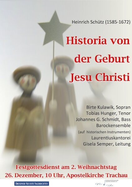 Zum Höhepunkt des Weihnachtsfestes erklingt am zweiten Weihnachtsfeiertag am Mittwoch, dem 26. Dezember, 10 Uhr, im traditionellen musikalischen Festgottesdienst in der Apostelkirche Trachau die „Historia von der Geburt Jesu Christi“ von Heinrich Schütz unter Leitung von Kirchenmusikerin Gisela Semper.