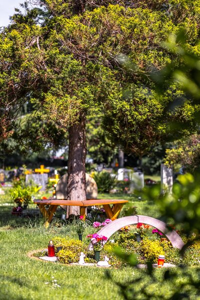 Sehenswert sind auch die verschieden gestalteten Urnengemeinschaftsanlagen. Der neuen Bestattungskultur Rechnung tragend und dennoch geschmackvoll und persönlich sind diese Grabstellen eine würdige Alternative zur zunehmenden Anonymität der Bestatteten.