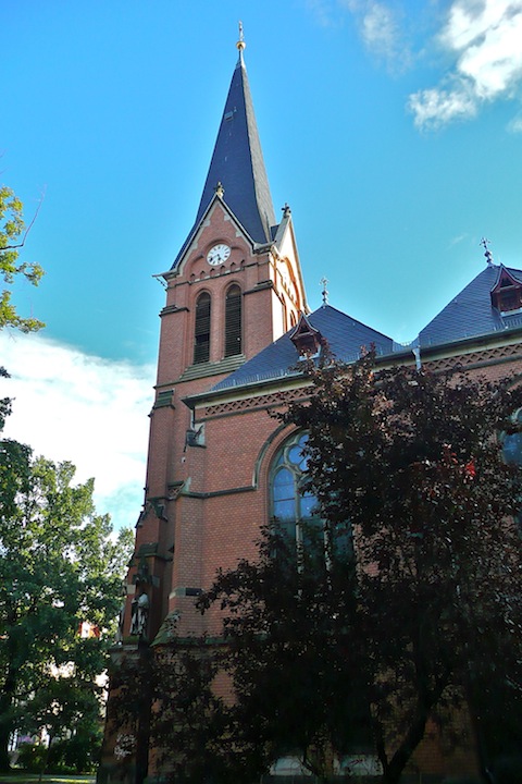 Nachdem die Pieschener und Trachauer Christen jahrelang Gottesdienste in der Schulturnhalle gefeiert hatten, konnte im Jahr 1888 nach 17 Monaten Bauzeit die St.-Markus-Kirche geweiht werden. Im Stil der Neogotik war eine Kirche mit 900 Sitzplätzen entstanden. Auffällig ist, dass der Altar in dieser Kirche im Westen steht, nicht, wie meistens üblich, dem aufgehenden Licht zugewandt. Das hat wahrscheinlich städtebauliche Gründe. Pieschen war damals schon relativ dicht bebaut.