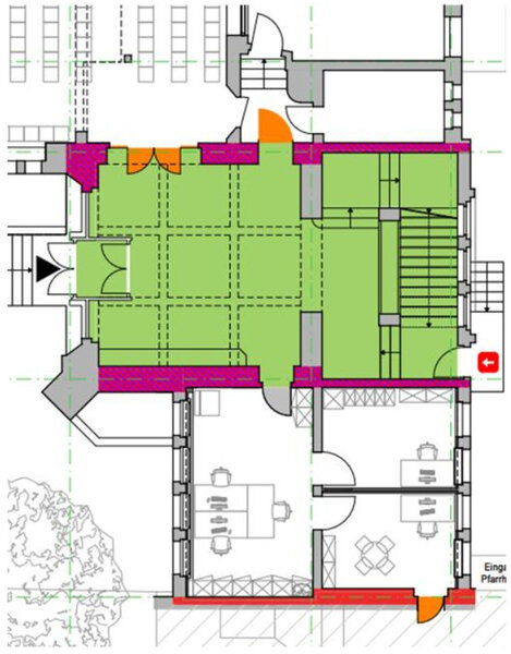 In einem ersten Bauabschnitt soll nun der zwischen Pfarrhaus und dem eigentlichen Kirchgebäude liegende Verbindungsbau saniert werden. Hier befinden sich der Grundstein, Toiletten, die Eingangshalle, das Treppenhaus, Kanzleiräume sowie Taufkapelle und Sitzungszimmer. Bei allen anfallenden Arbeiten soll viel historische Bausubstanz erhalten bleiben und nur behutsam in den Bestand eingegriffen werden. Die Heizungs- und Elektroinstallation werden größtenteils komplett erneuert. Durch verschiedene bauliche Maßnahmen wird der Brandschutz an die aktuell geltenden Bestimmungen angepasst.